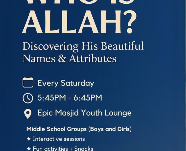 announcement Who Is Allah announcement EPIC Caree Club announcement Cover 2 Cover announcement 40 Hadith announcement Tafseer Surat Sajda announcement Community Service is part of our Faith